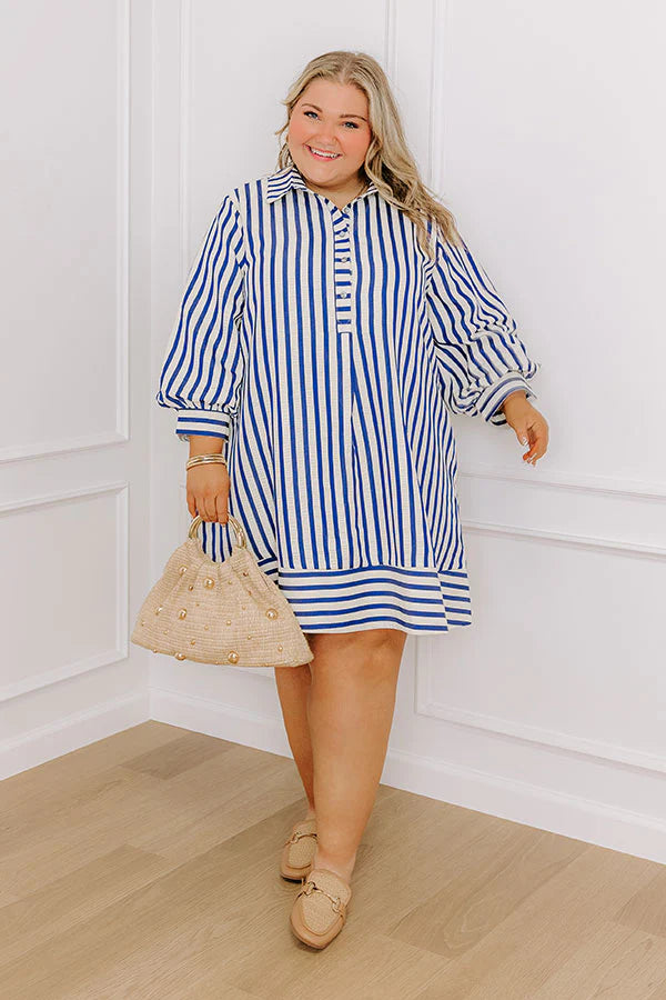 - Take a stroll down the boardwalk in this adorable mini dress! Featuring a timeless stripe pattern and lightweight fabric, it's a must-have for effortless style as we move into warmer days ahead. Stay trendy for spring break and beyond with this charming piece. - Lightweight material with a striped print - A built-in lining - Long sleeves with buttoned cuffs - A collared neckline - Hidden side pockets - A relaxed silhouette that ends in a straight hemline