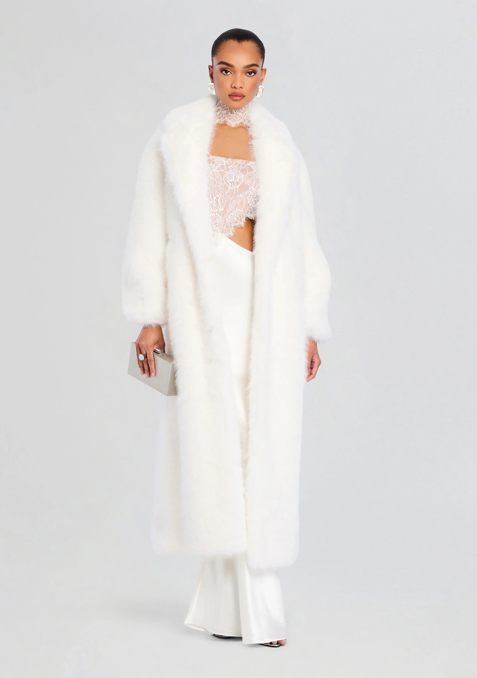 The Dasha Faux Fur Jacket is a luxurious and cozy piece that will keep you warm and stylish all season long. This stunning jacket is made from plush faux fur and features a timeless design that will never go out of style. Shown here in White.