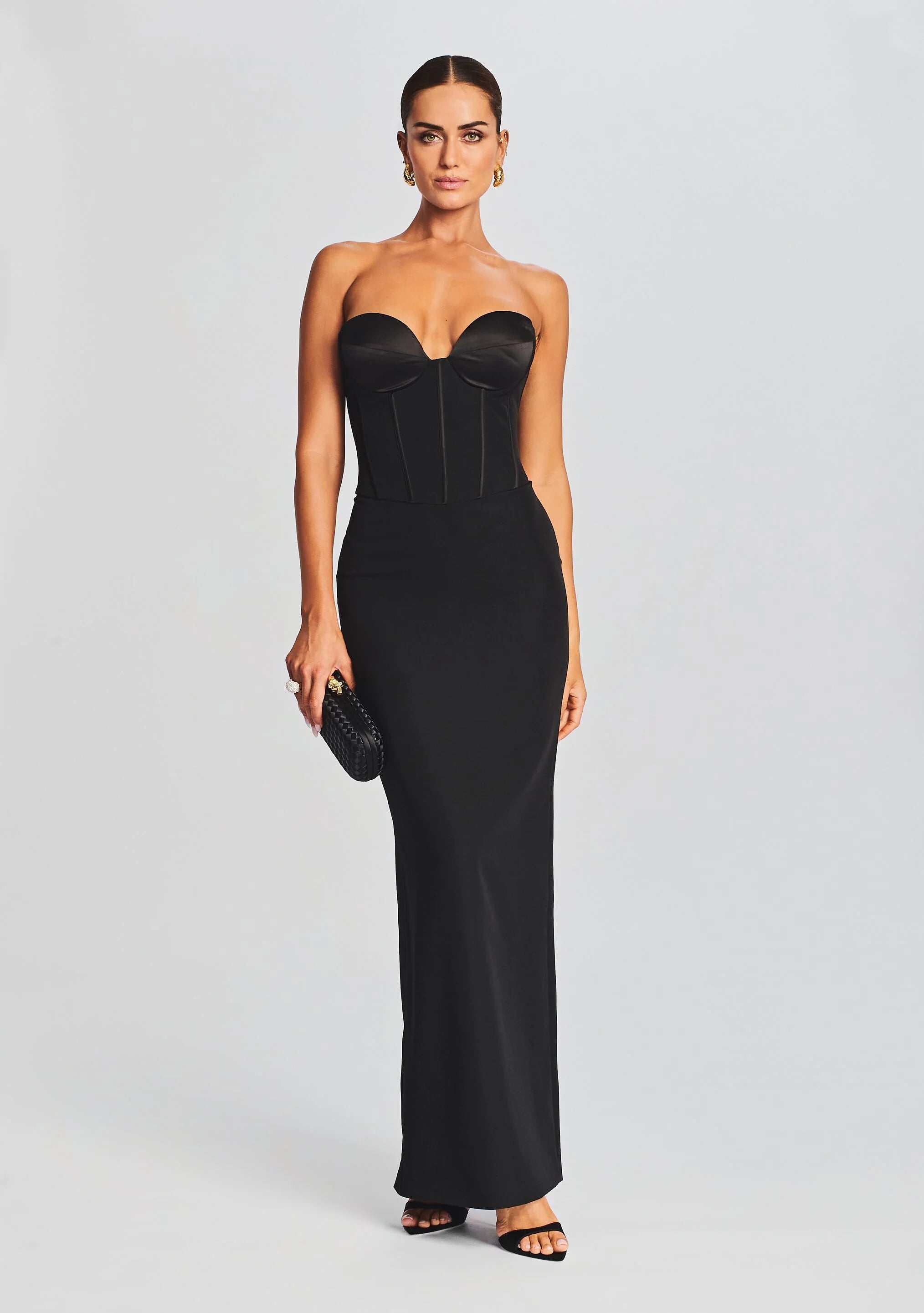 Embrace an era of seductive sophistication in our Luna Dress. This strapless maxi dress features a semi-sweetheart neckline, corset-style lined bodice, and pencil skirt. Shown here in Black.