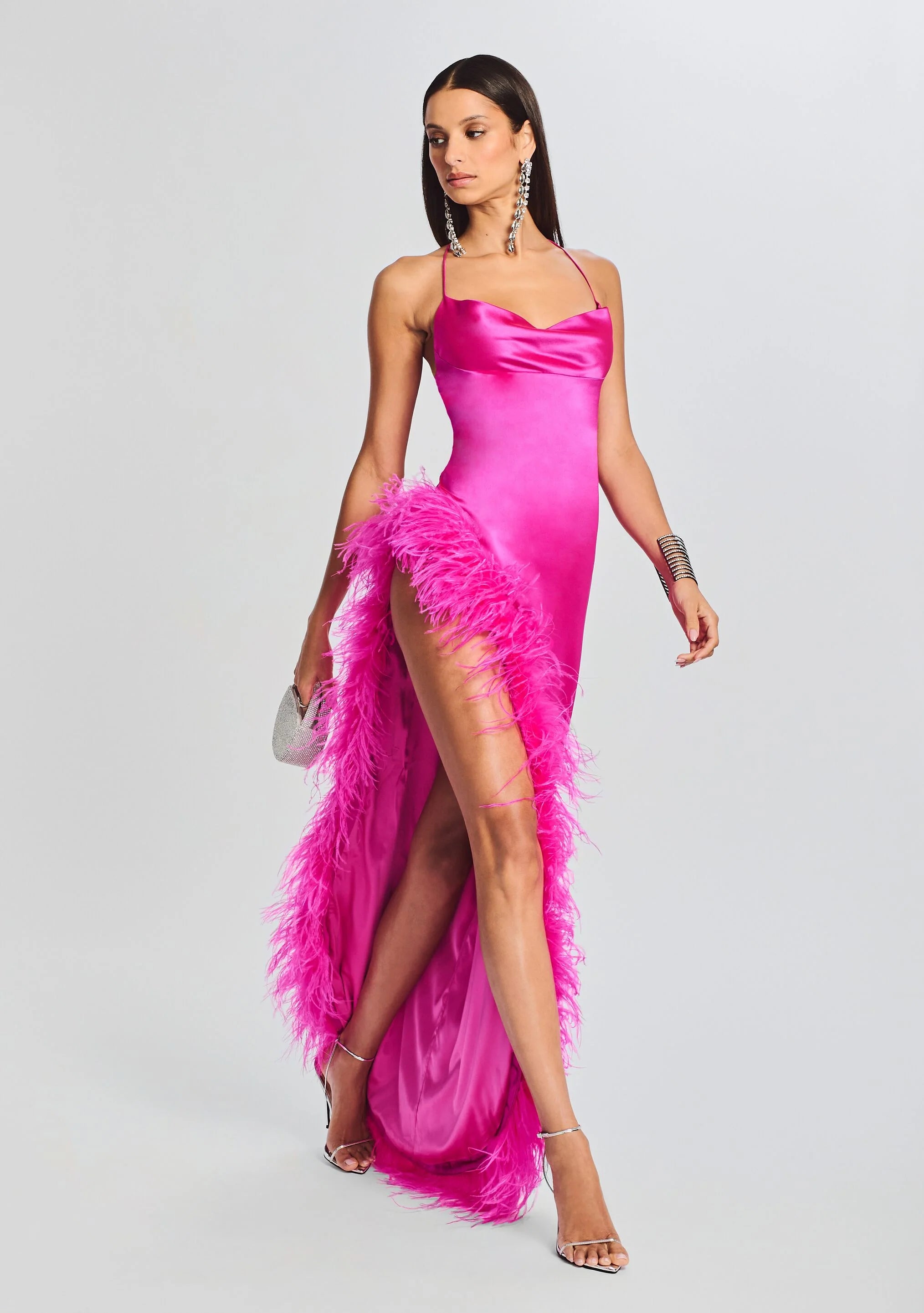 Add some flair to your next evening out with our Priscilla Feather Dress. This otherwise simple silk gown is instantly elevated by its feather trim along its thigh-high slit. This style also features a slightly draped cowl neck and barely-there straps that tie and adjust at the back. Shown here in Neon Pink.